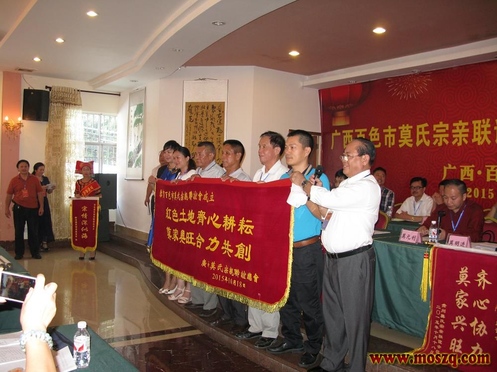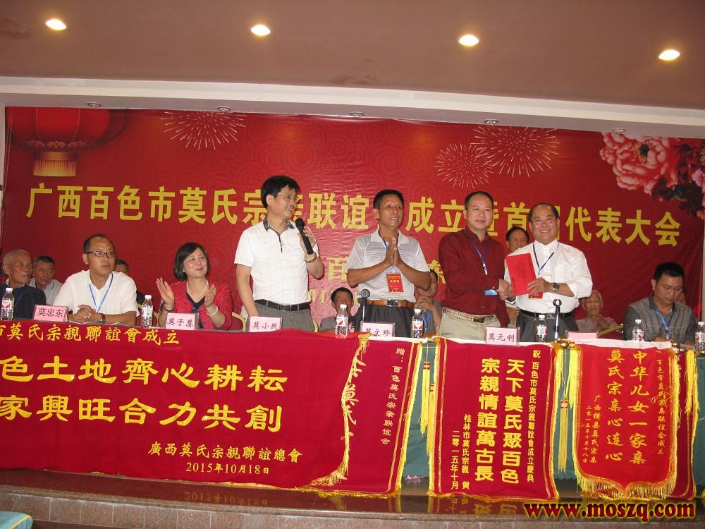 广西总会组建代表团参加百色市莫氏宗亲联谊会成立暨首届代表大会 金秋十月,阳光灿烂。十月十七日,广西莫氏宗亲联谊总会代表团一行四十八人,在总会会长莫元利丶常务副会长莫敏丶莫炳宁丶莫炳斌带领下,赴革命老区百色市田东县,参加百色市莫氏宗亲联谊会成立暨首届代表大会。(执行会长莫小民,秘书长莫东烽丶办公室主任莫贵良等一行己先一天到达田东县,为百色市莫氏宗亲联谊会成立大会的筹备工作作最后的指导。)10月17日下午1时30分,由十八辆轿车组成的代表团车队从南宁出发,向百色田东县进发,浩浩荡荡的车队在高速公路上飞驰,一路上我们看到了从公路两边树丛中时而出现的壮乡小楼,它告诉人们人民的生活水平在不断提高;田野里翻腾着金黄色的稻浪,它告诉人们这又是一个丰收年。下午四点车队到达田东县,百色市宗亲会的主要领导亲自到高速路口迎接,当晚与来自百色市12个县(区)的莫家宗亲,在田东县新天地大酒店欢聚一堂,共进晚餐,举怀畅饮,高呼“齐心合力,莫家兴旺”。十八日早上九点新天地大酒店大会场,四百多莫家兄弟姐妹们齐声高唱中华人民共和国国歌,百色市莫氏宗亲联谊会成立暨首届代表大会在国歌声中隆重开幕。会议由百色市会长莫明进主持,广西总会莫元利会长丶首届广西总会会长(广西终身名誉会长)莫文珍丶广西总会执行会长莫小民分别讲了话,贵州丶重庆等各地莫家宗亲代表先后发了言。大会就各地宗亲会的筹建和成立问题丶开展莫氏文化研究编纂族谱问题,整合莫氏资源发展经济等一系列问题,进行了探索性的讨论和安排。大会在热烈的气氛和浓浓的亲情中圆满结束。 |